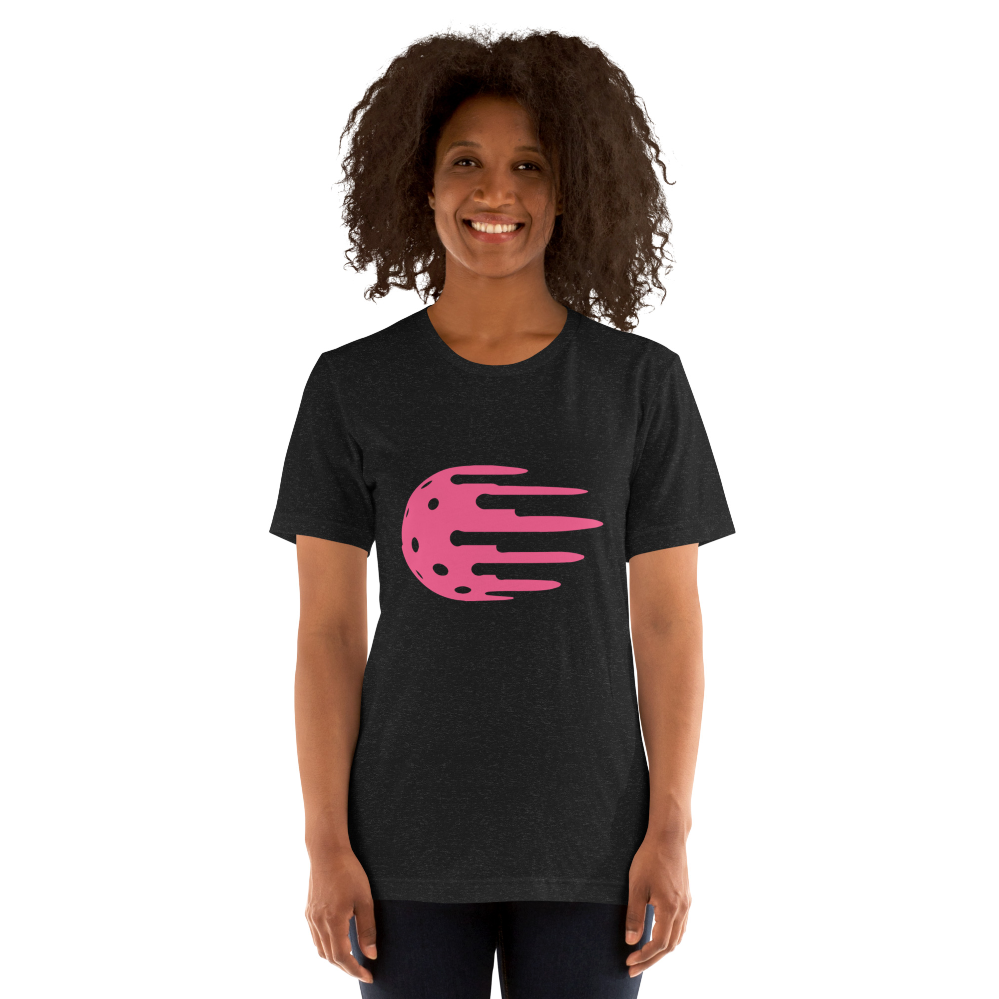 Women's black tee, pink logo. Feels soft and light with just the right amount of stretch.