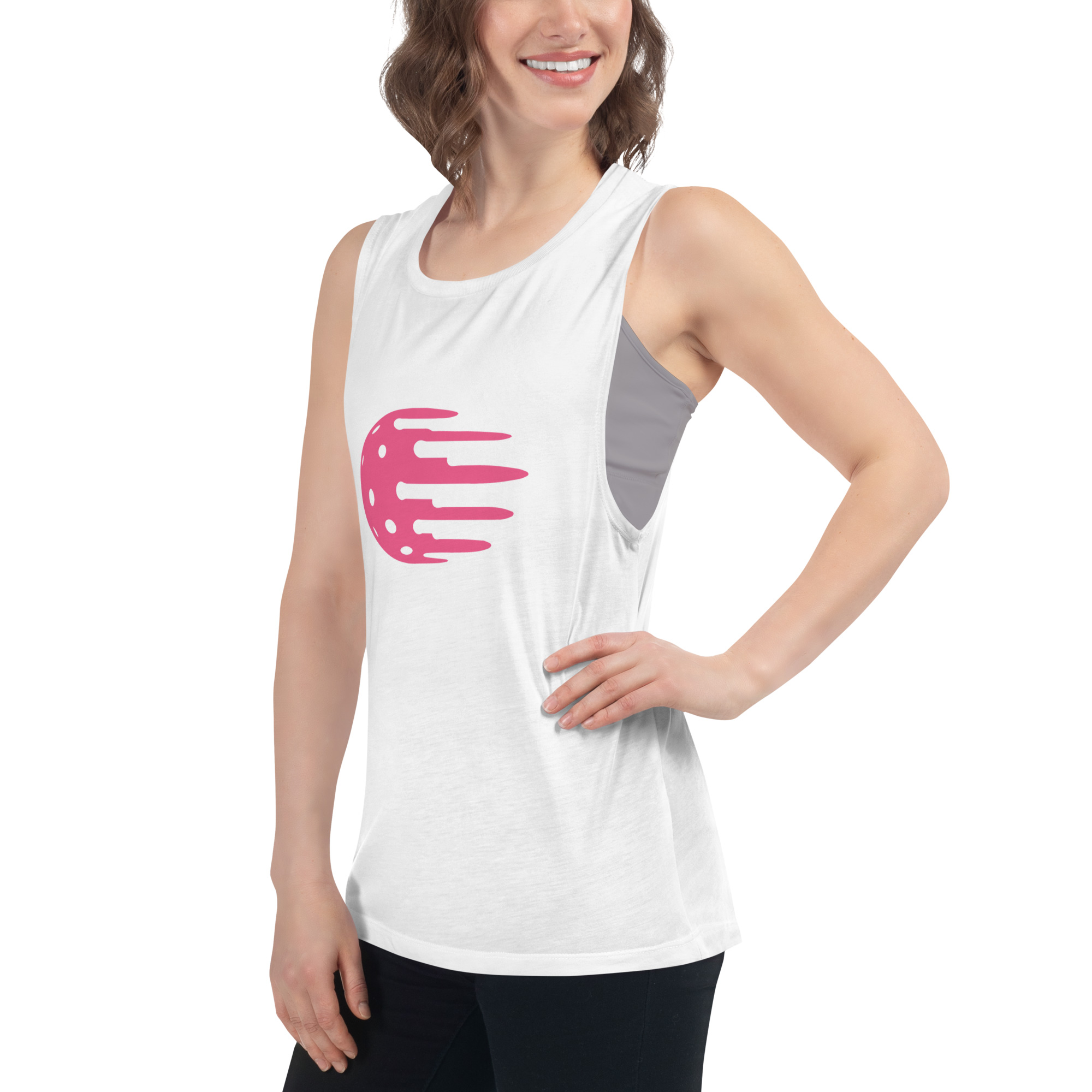 Women's White Tank, pink logo. Feels soft and light with just the right amount of stretch.
