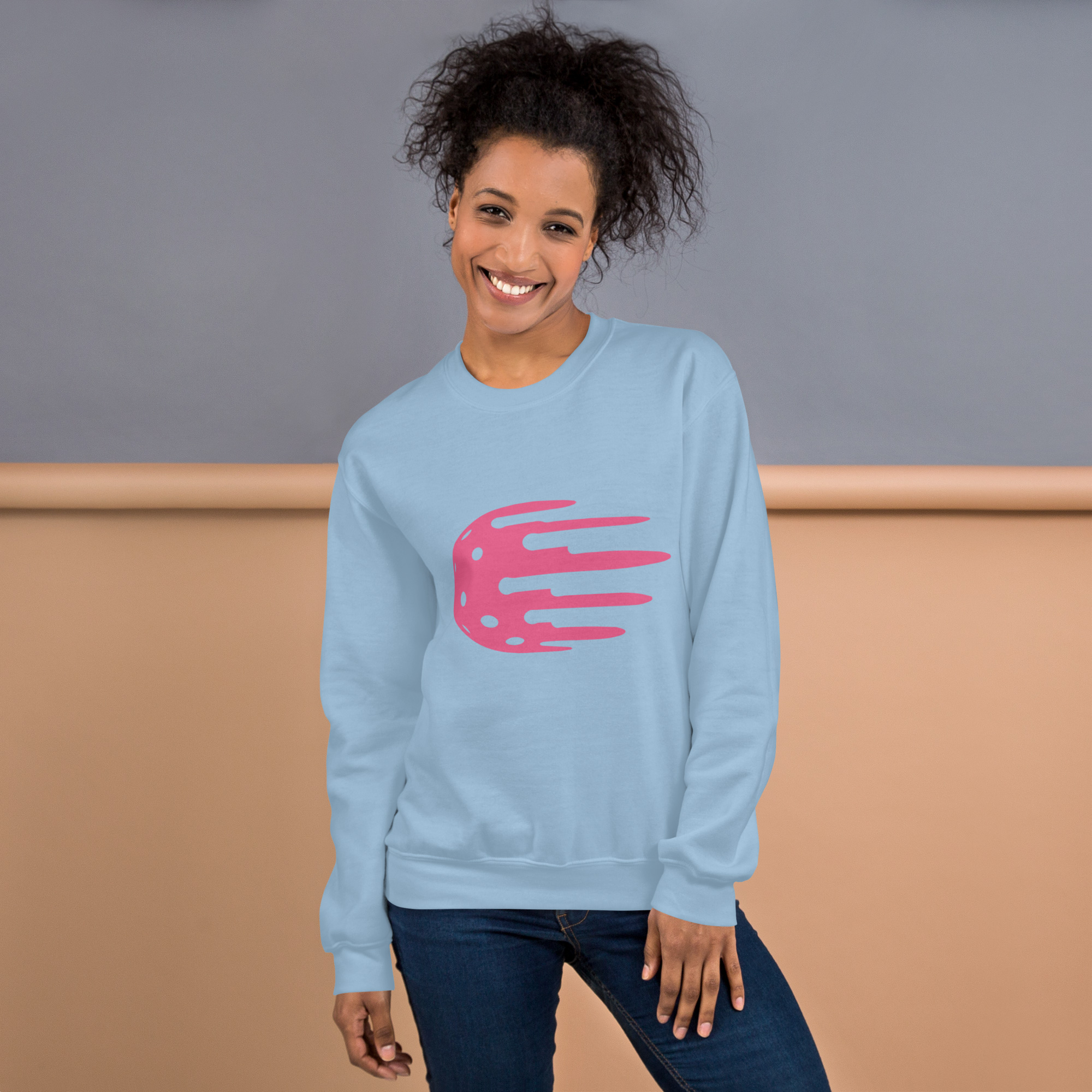 Women's light blue sweatshirt, pink logo. Feels soft and light with just the right amount of stretch.