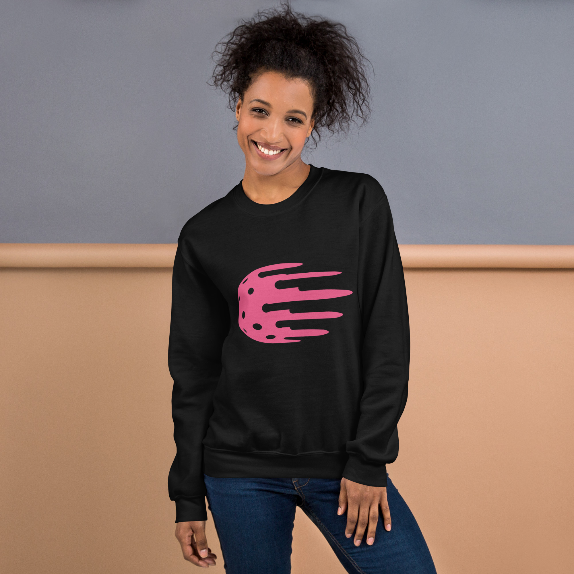 Women's black sweatshirt, pink logo. Feels soft and light with just the right amount of stretch.