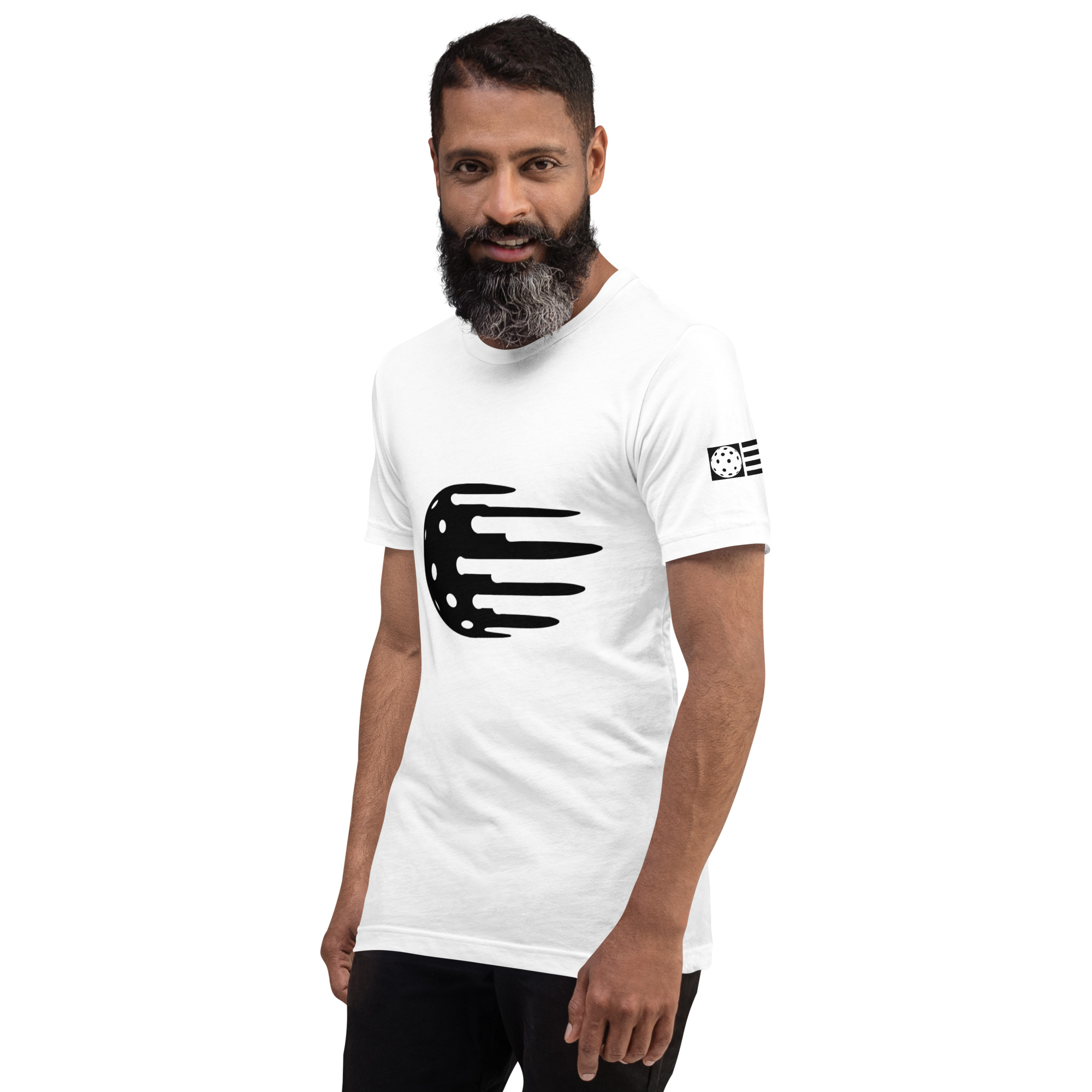 Men's white t-shirt, black logo feels soft and light with just the right amount of stretch.