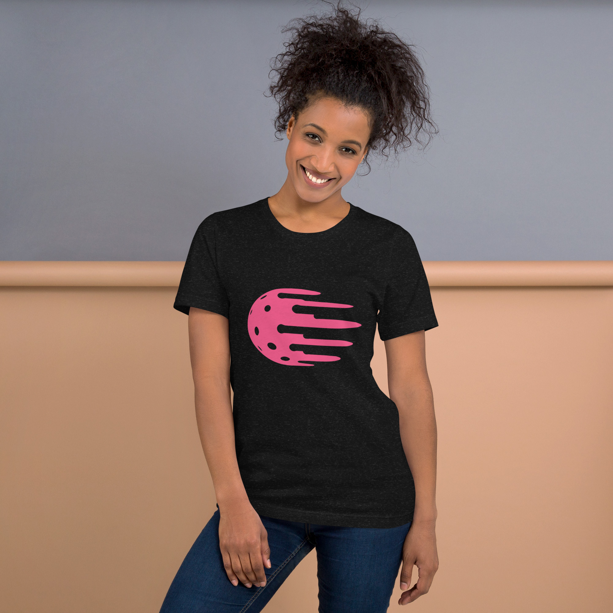 Women's black tee, pink logo. Feels soft and light with just the right amount of stretch.